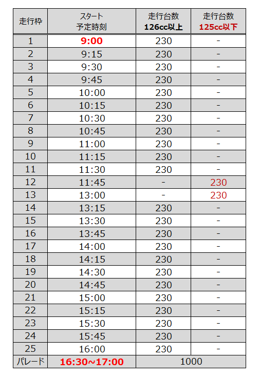 125cc以下は11:45~/13:00~の走行枠及び16:30~のパレードラン枠での走行が可能です。