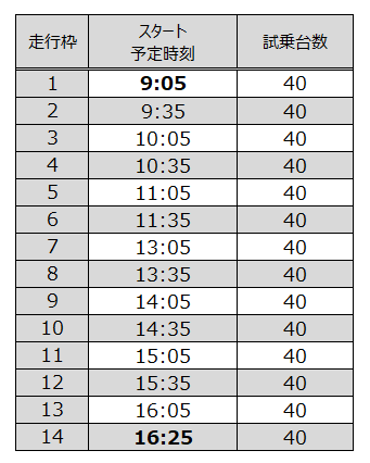 ※「事前予約車」の試乗には、専用URLから事前にご予約いただく必要がございます。専用URLは、チケットをご購入いただいた方へ後日改めてご案内いたします。「当日受付車」は、当日会場にてお並びいただくことでご試乗いただけます。