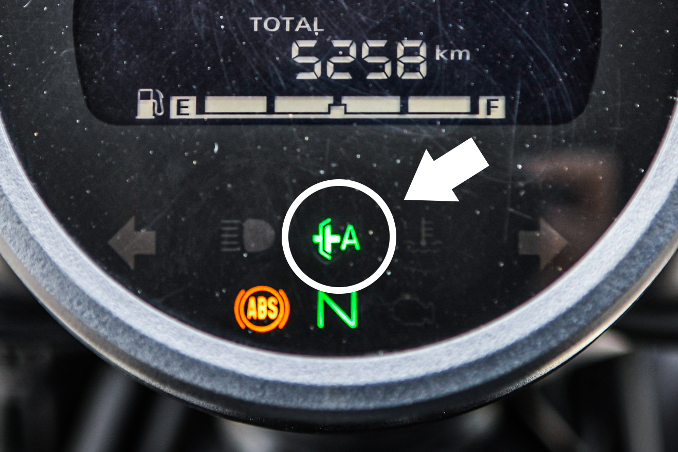 このAマークがグリーンに点灯している状態がHonda E-Clutchの制御が効いている状態であり、クラッチ操作が不要なモードになっています。(クラッチを握るとAマークは消灯してHonda E-Clutchが解除されます)