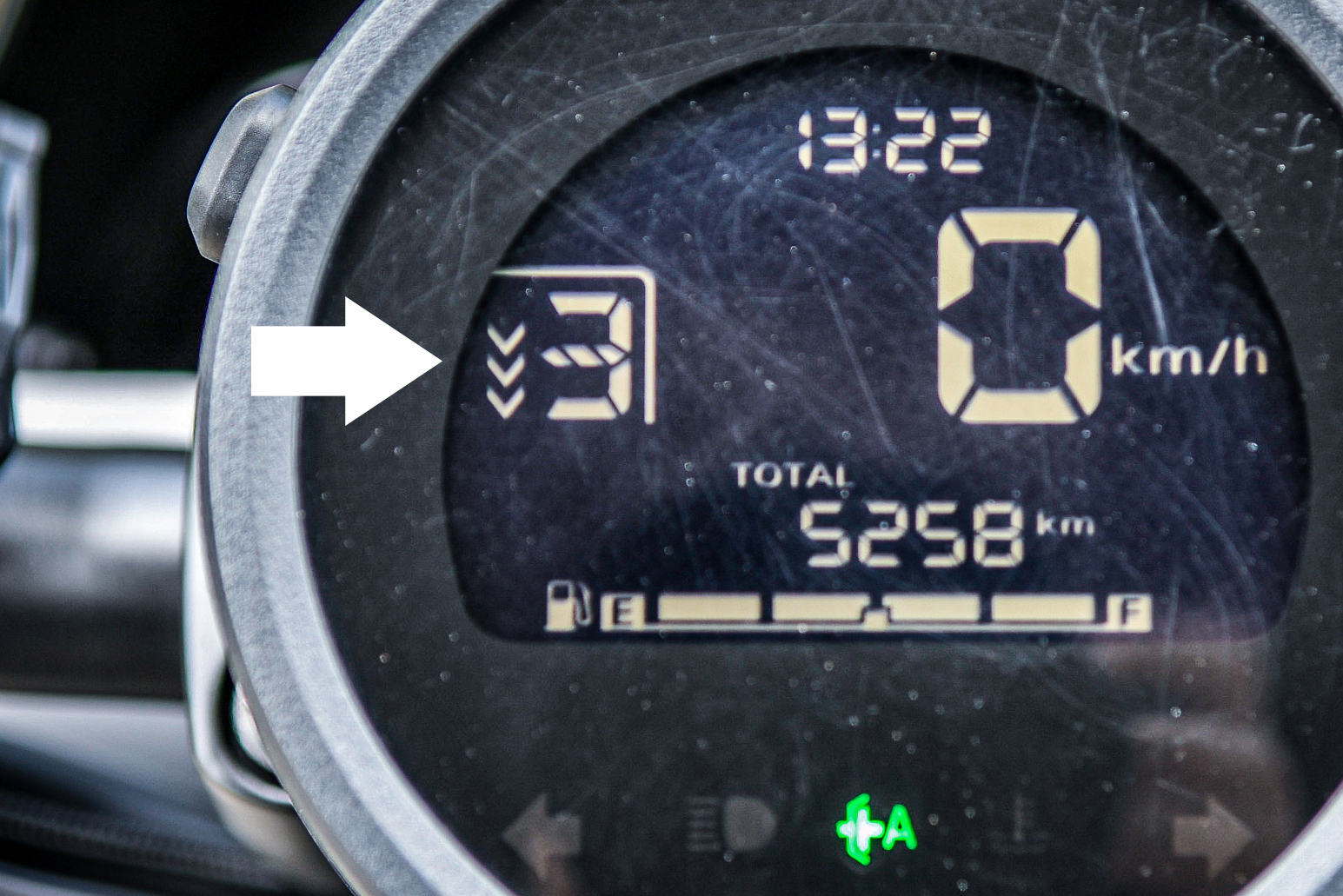Honda E-Clutch制御モードがオンの状態であれば、ギアが入ったままの停止時でもエンストすることがない(Honda E-Clutch制御モードがオフの場合はエンストします)ので、極端な話をすると6速のまま走ったり停まったりすることもできますが、ライダーがギアチェンジを忘れていたり、ギアが現状の回転域に不相応な場合はシフトダウンを促してくれる矢印マークも表示される仕組みになっています。