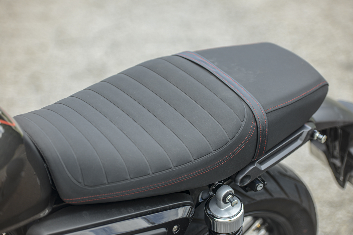 ステッチの入ったタックロール風のシートや小型化されたフロントフェンダー、テールライトによって軽快感を演出。