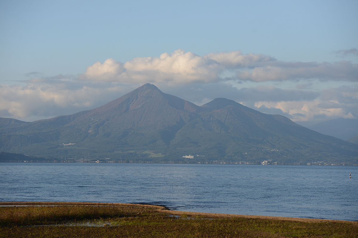 撮影で訪れた青松浜は、湖越しに遠く磐梯山を眺めることができる絶景スポット。