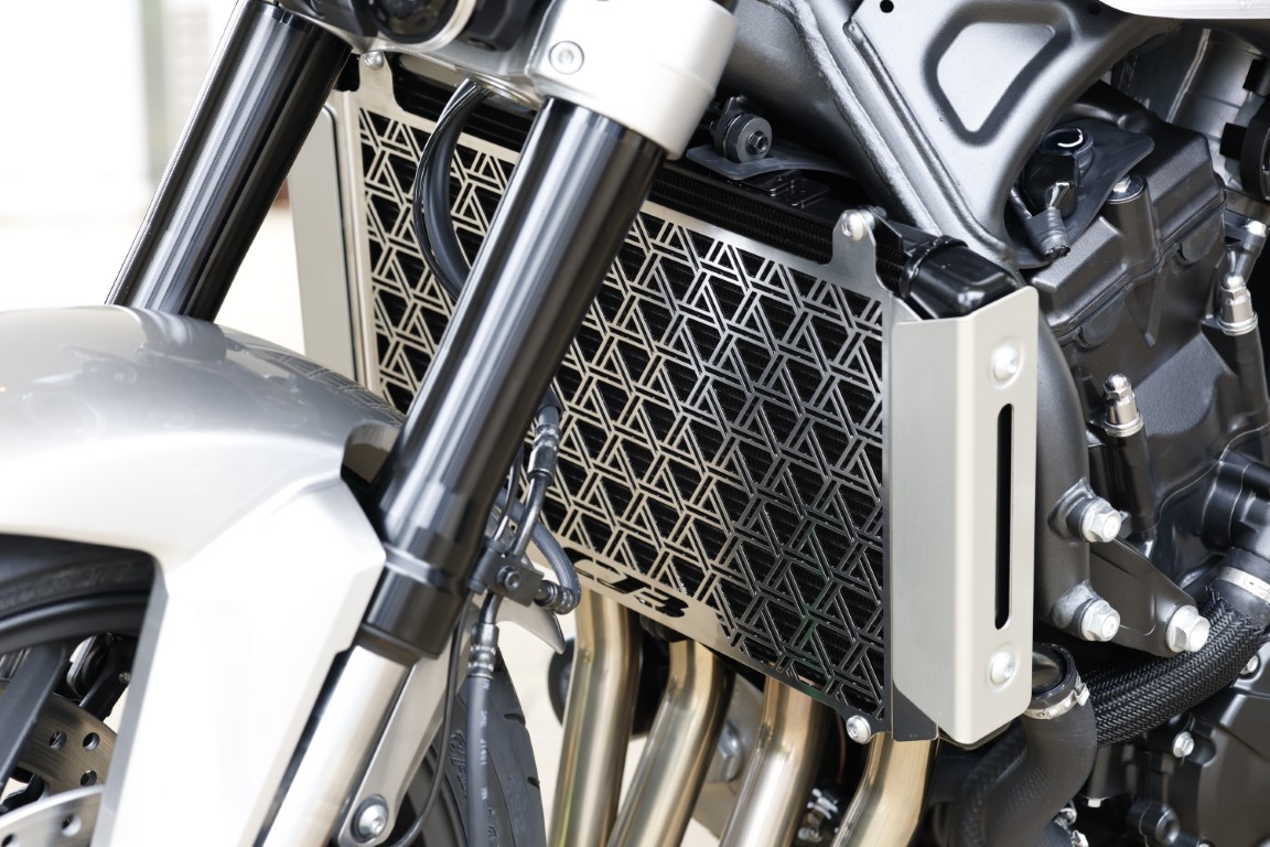 CB1000F SEには標準装備されていますが、フロントタイヤが巻き上げる飛び石などからラジエーターフィンを保護でき、ドレスアップ効果も高いので、CB1000Fに乗る方も後付けできるのは嬉しいポイント。