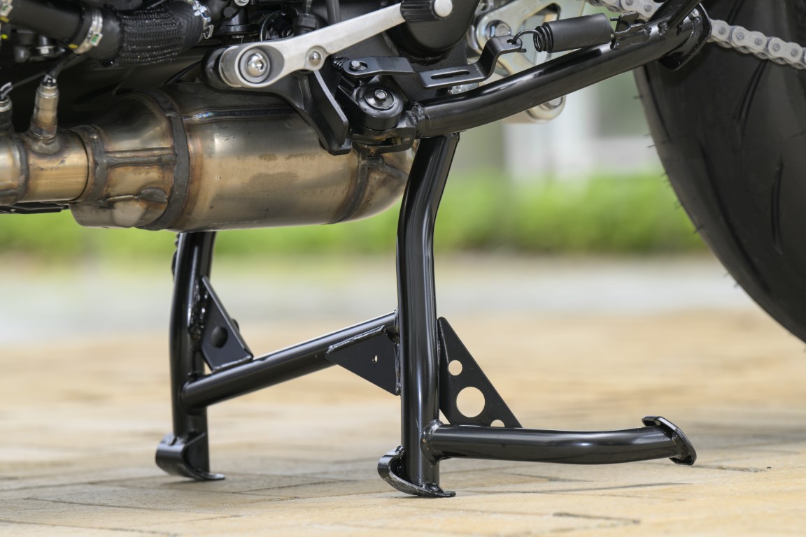 特に、地面に接地する接地プレートの大型化と専用設計ならではのスタンド形状でより軽い操作感を実現しています。筆者も実際にこのセンタースタンドをかけてみましたが、大型バイクとは思えないほど軽い操作でスタンドアップできました。