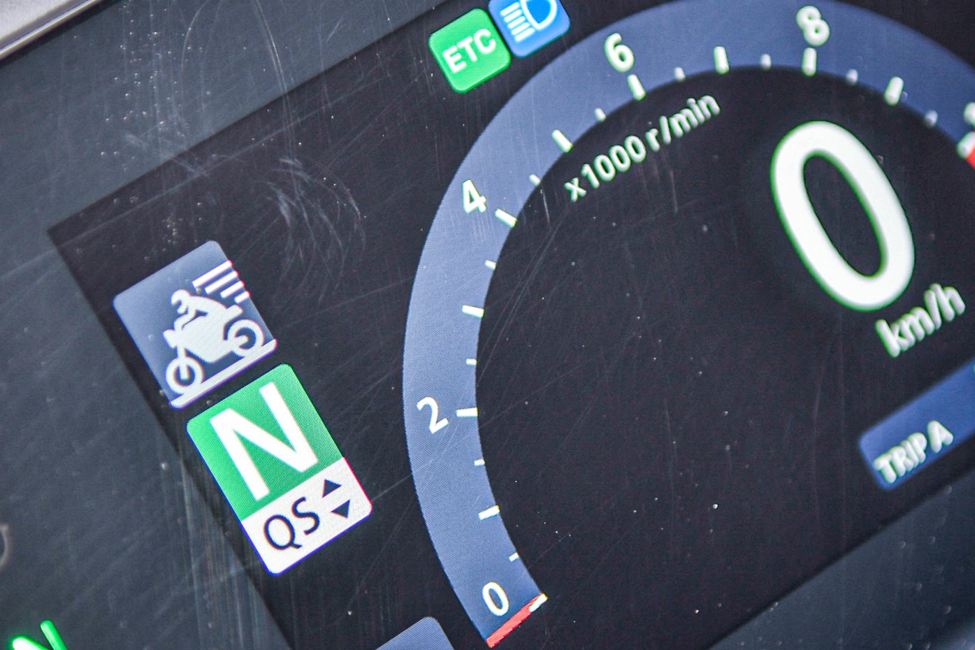 ライディングモードの設定を表すメーター左上のライダーマークが、低く伏せた前傾姿勢になって疾走モードに変化します。というかこの「マークでライディングモードの状態を表示する」を考えた人のセンス良すぎ。なんだかちょっとほっこりしつつ、ヤル気がでる(笑)