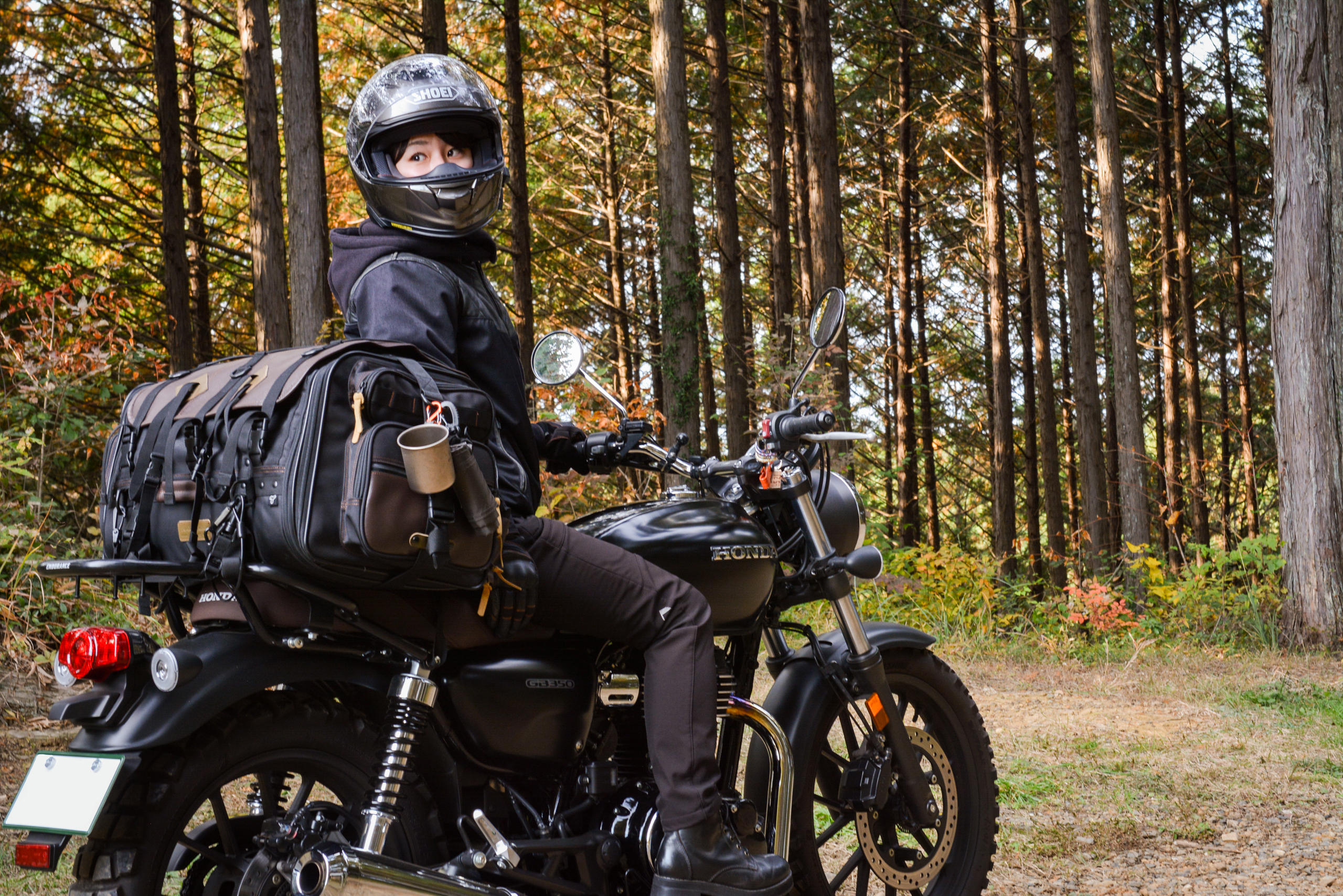なおさんのGB350のリアシートにはキャリアが装着され、大型のラゲッジバッグが搭載されていました。