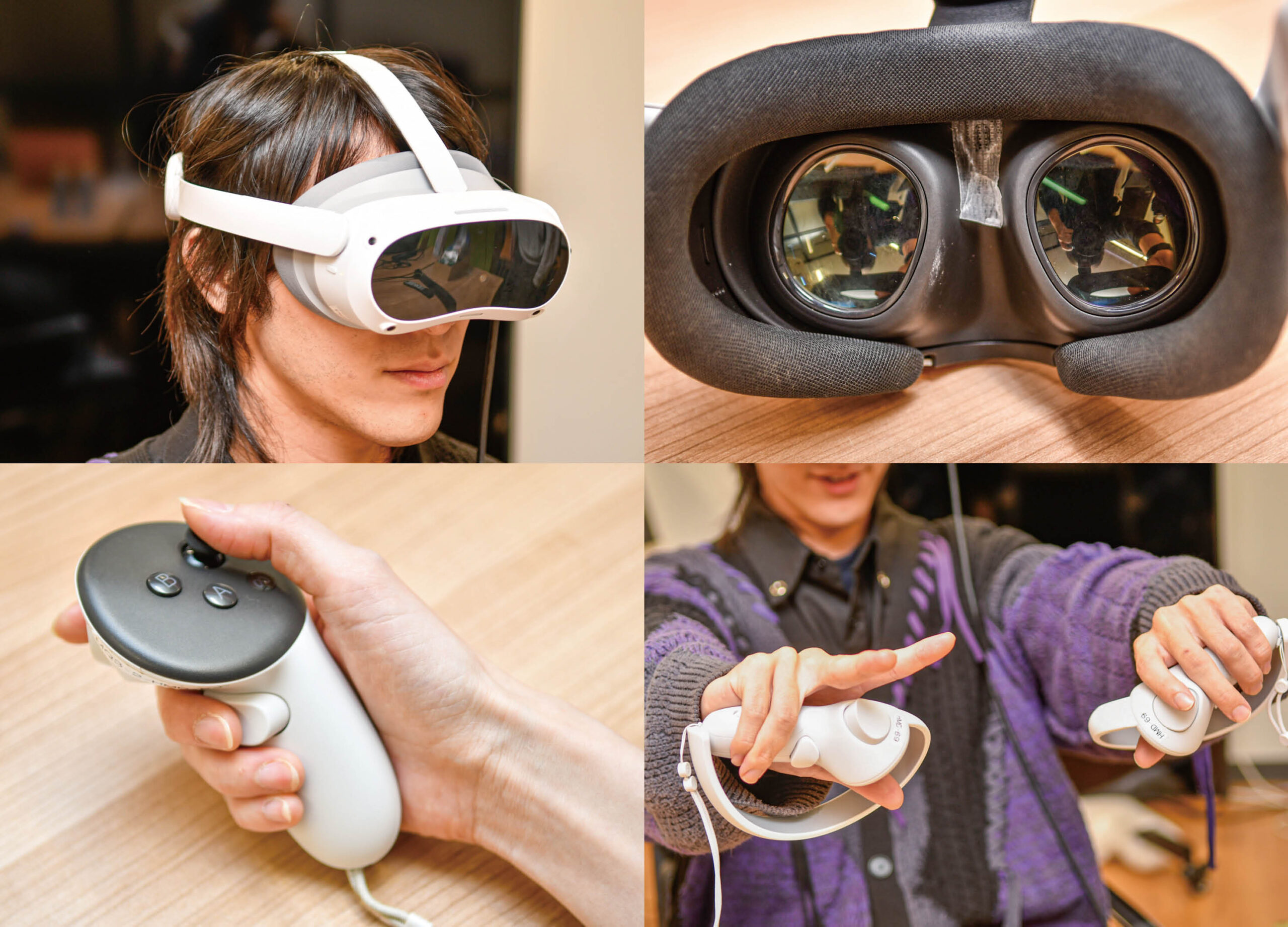 一般的なVRゴーグルには、音声が骨伝導で聞こえるヘッドセットや自分の声で喋れるマイクも備わっていて、手や指の動きを感知するセンサーが搭載されたVR専用のコントローラーを両手に持って操作します。