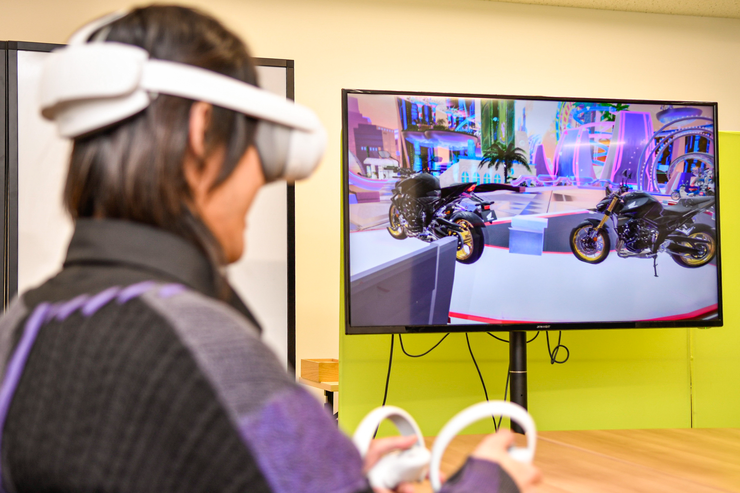HondaブースをVR上で再現したメタバース空間は、目の前に映し出される視界が自分にとっての「リアル」になり、ディスプレイに映し出される映像を見るのとはまるで違う感覚。ブースに設置されているバイクや展示物が浮き出てくるような立体感があって没入感が全然違うんです。