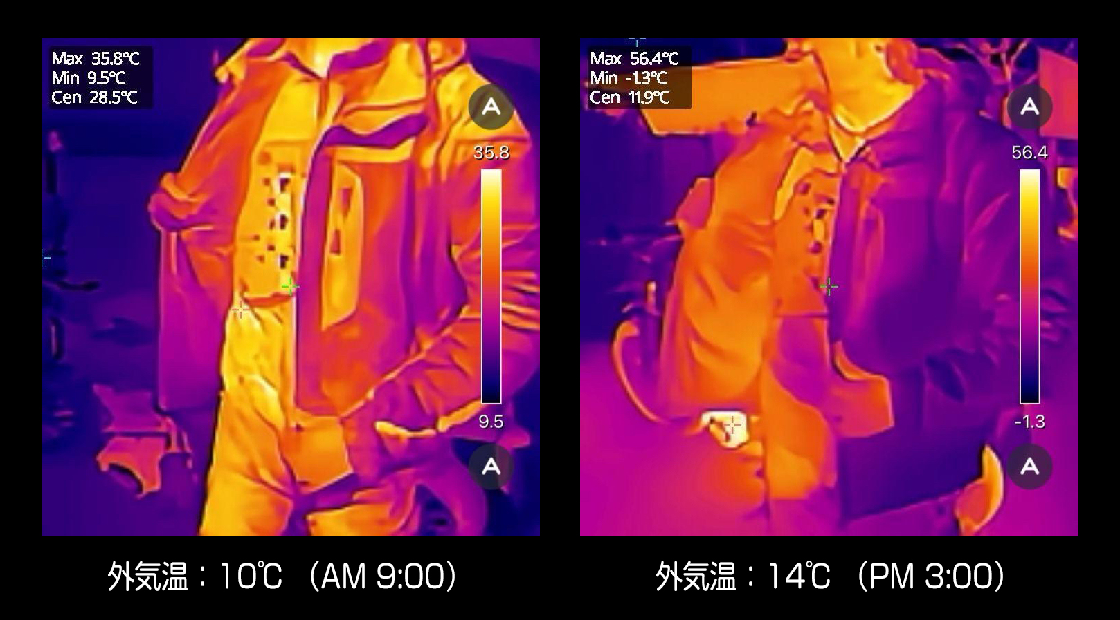 しかし、6時間走って走行風をダイレクトに受けていたライダーはそれなりの寒さは感じています。出発前と後のサーモグラフィーカメラを見比べてみると、午後3:00のライディングジャケットの表面は全体的に-1.3℃くらいを示す紫色に変化しているのが見てとれます。