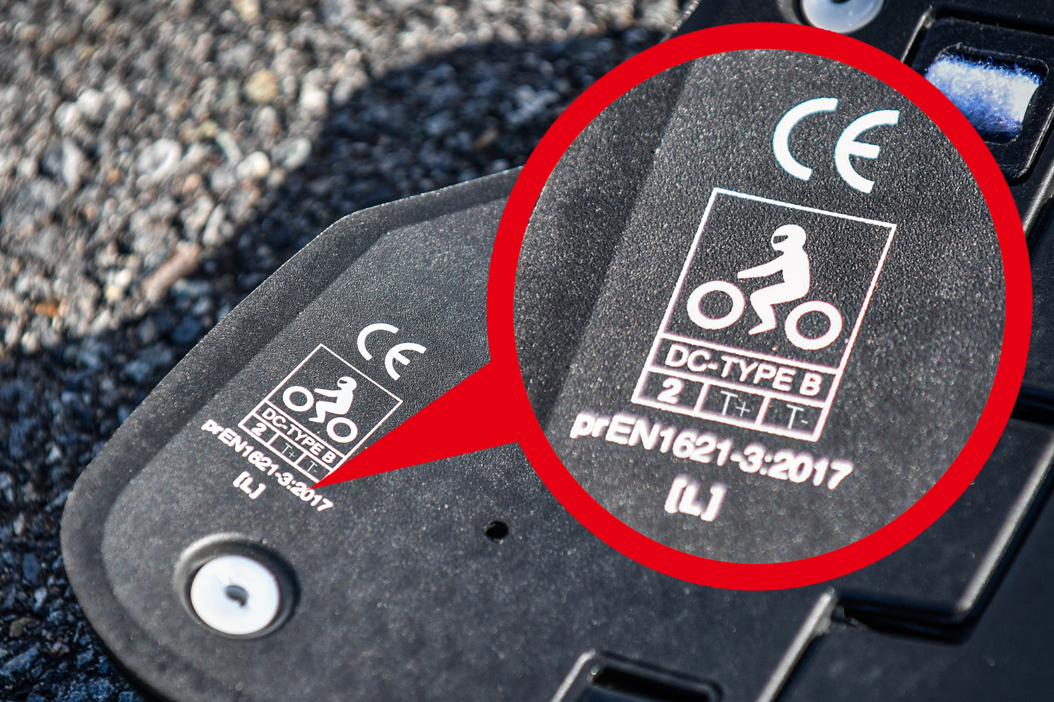 プロテクターの裏面にはその安全性能を示すCE規格をクリアした表記がデザインされているのですが、その中でも注目したいのは「DC TYPE B」の下にある「2」や「T+」「T-」の表記。