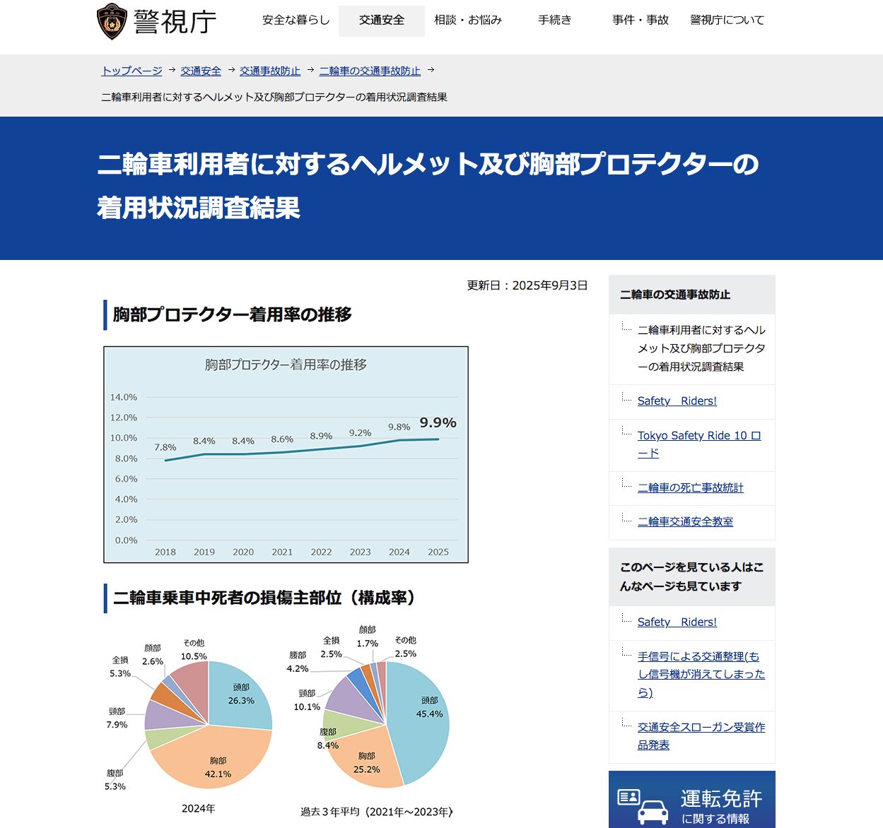 こうした背景の中、警視庁では二輪車に乗るライダーの安全意識を把握するため、例年「二輪用胸部プロテクターの着用状況調査」を実施し、その結果を公式ホームページなどで公表しています。