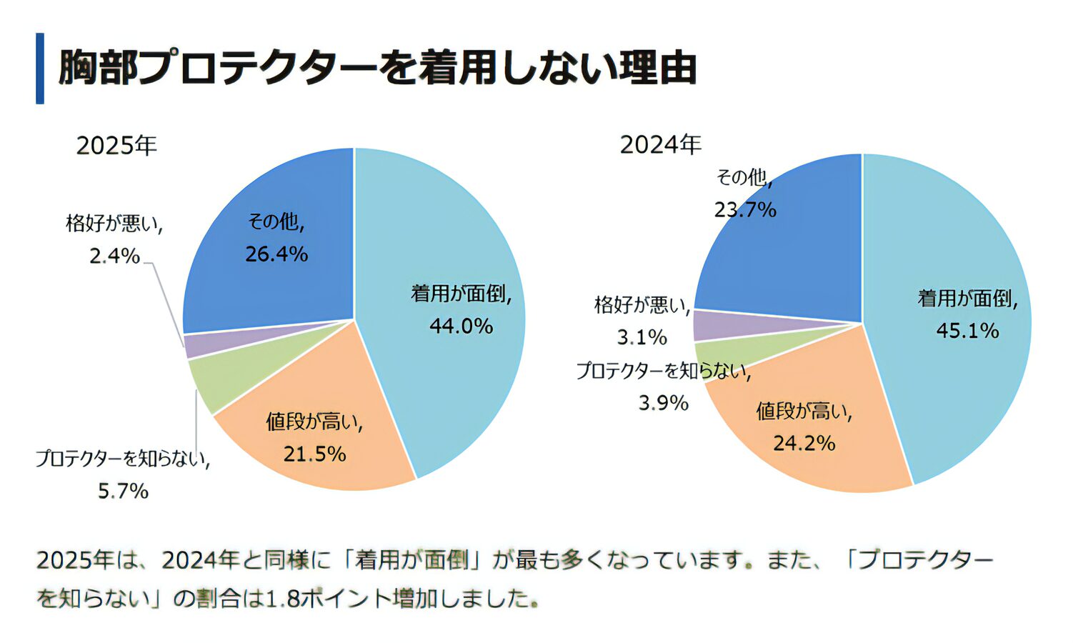 一方で、同調査で「プロテクターを着用しない理由」として最も多く挙げられたのが、「装着が面倒(44.0%)※2025年度」という回答です。