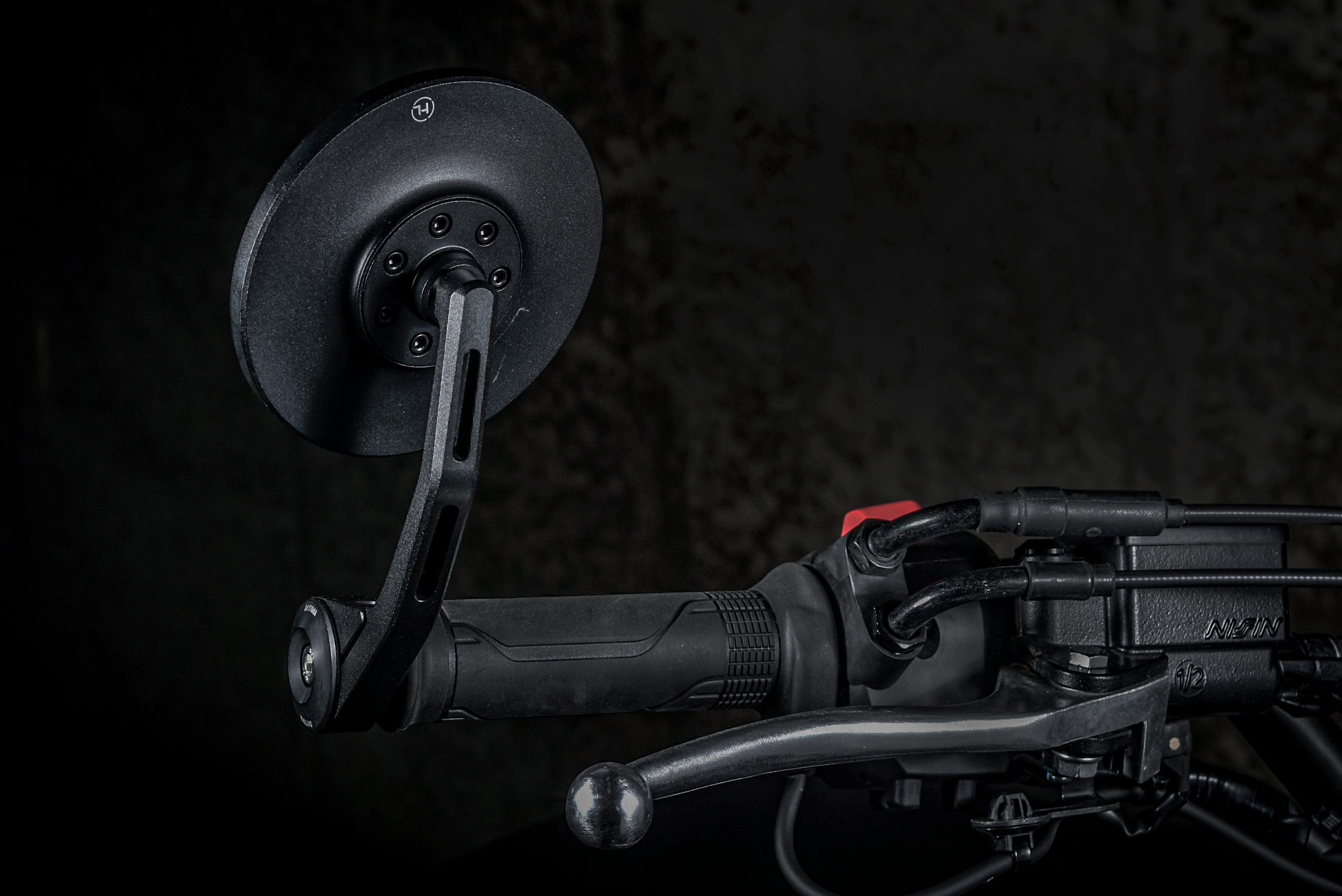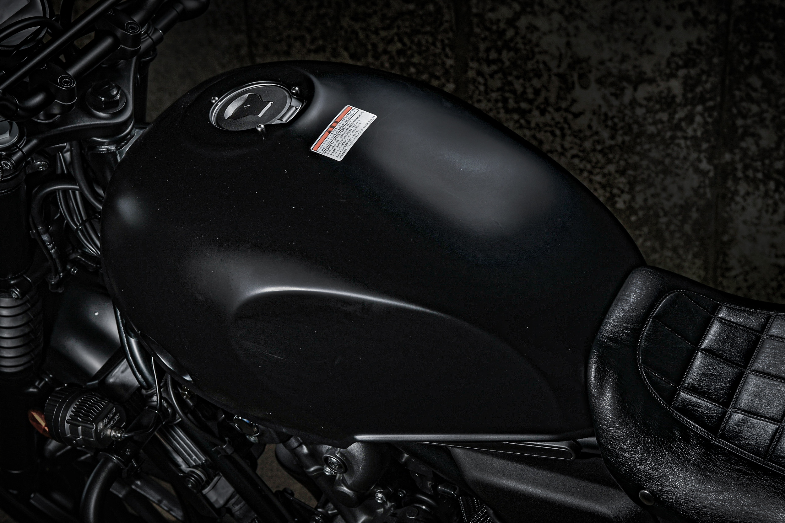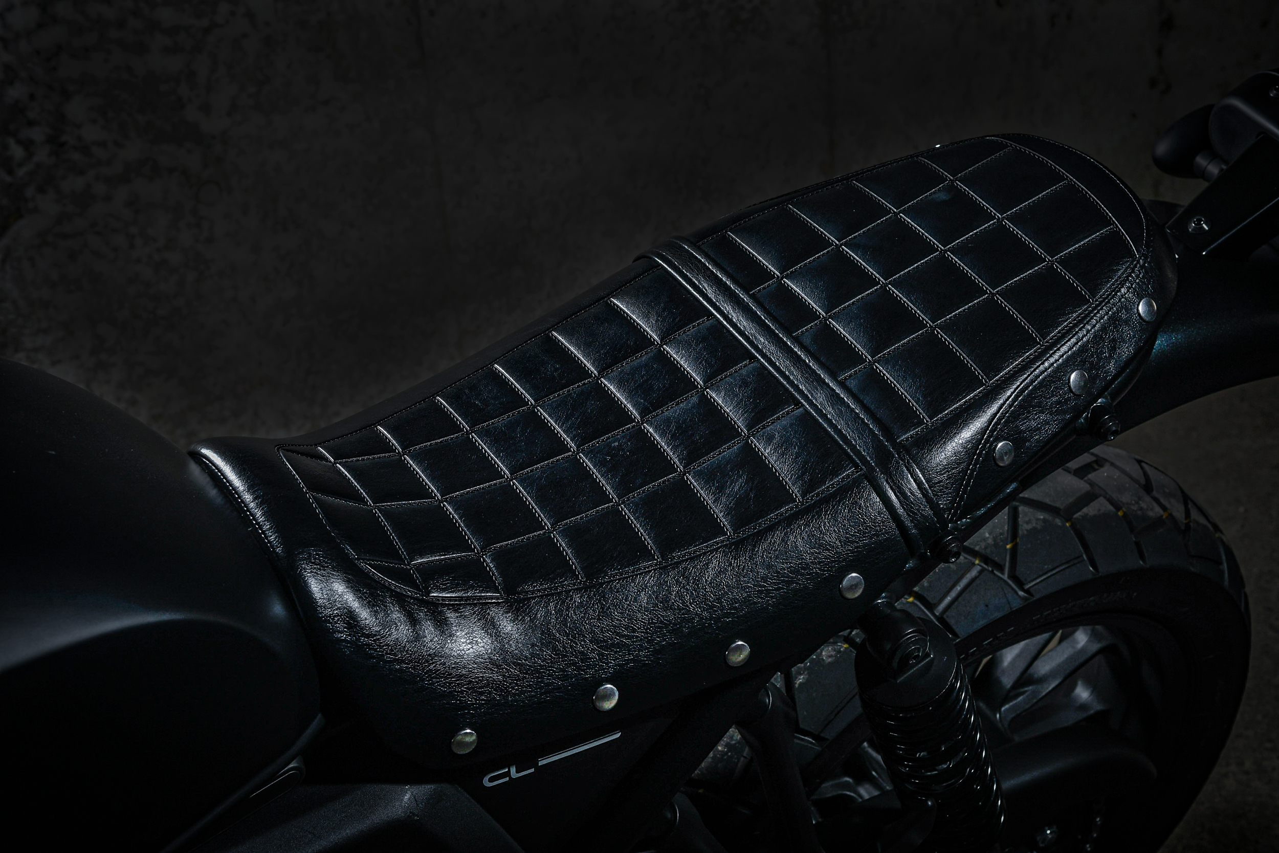 そのタンクカバーとセットで車体のイメージを決定づけている「スタッズスクランブラーシート」もこれまた強いカスタム感。黒く輝く革の艶感とスタッズの醸しだすワイルドさ。……迫力ありすぎ。