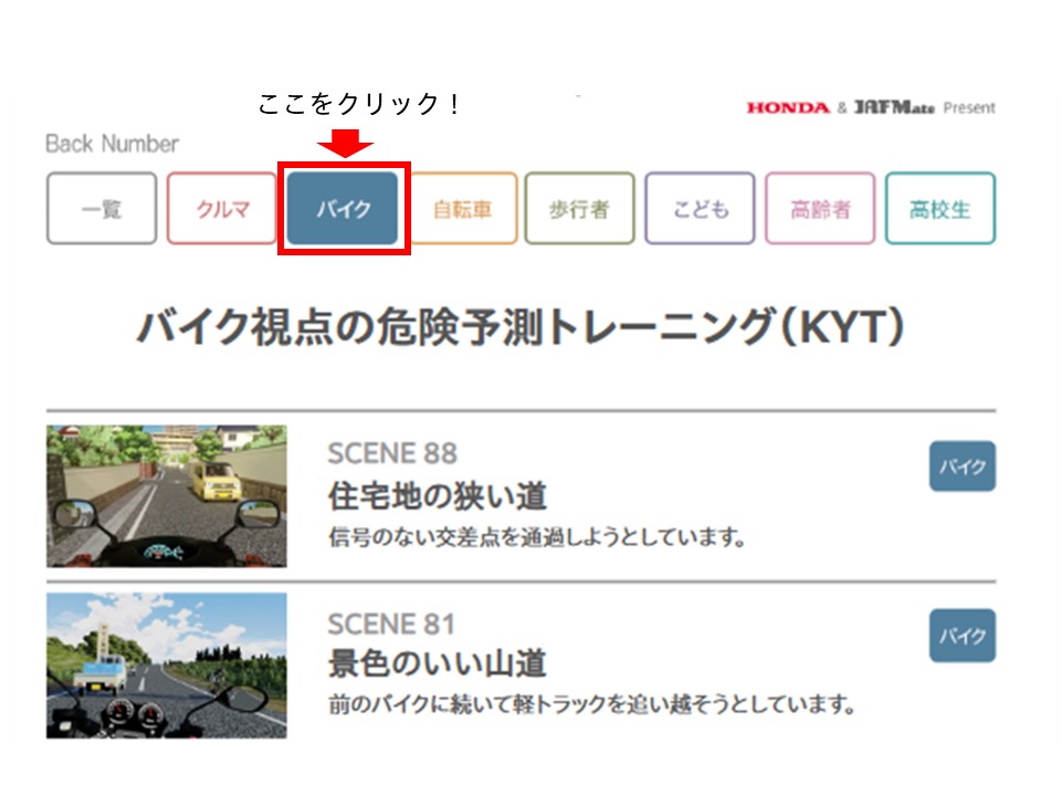 バイク視点に特化した危険予測トレーディング(KYT)ページが開き、バイクにまつわるKYTを受講できます。