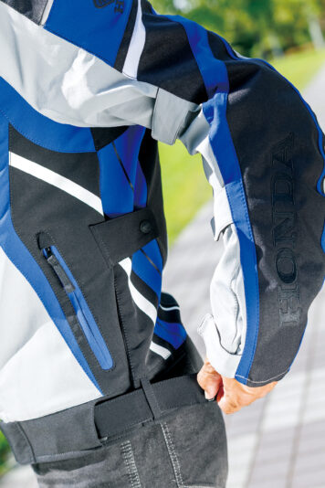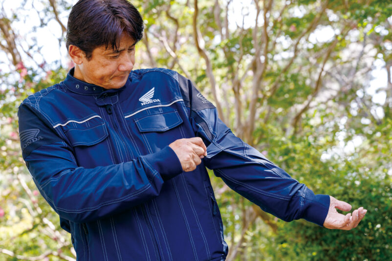 「他ブランドに比べると、ホンダのウエアはいたずらにその時の流行を追わないデザインのものが多い印象があります。ある意味オーソドックスな色や形なので、長年着ていても違和感ないのが良いところなのかも? と思ったりします。このジャケットもそんなホンダのウエアらしいというか、奇をてらわないデザインです。着心地、フィット感、重さなど、いずれも好ましく感じました。個人的な感覚ですが、ライディングジャケットのポケットにはあまり物を入れない方なので、ポケットは胸に1つあれば良いかな、と思っています。ポケットに物が入っているとライディング時に気になったり、ウエアのシルエットが崩れる気がするので……。ただ、ポケットが多くて収納力高い方が好みという人も、結構多いですよね? そういう方にとっては、このジャケットのポケットは高く評価されそうだなと思いました」