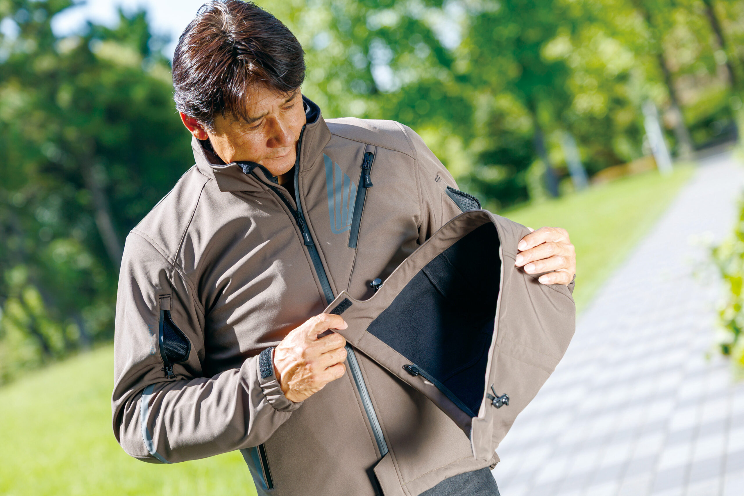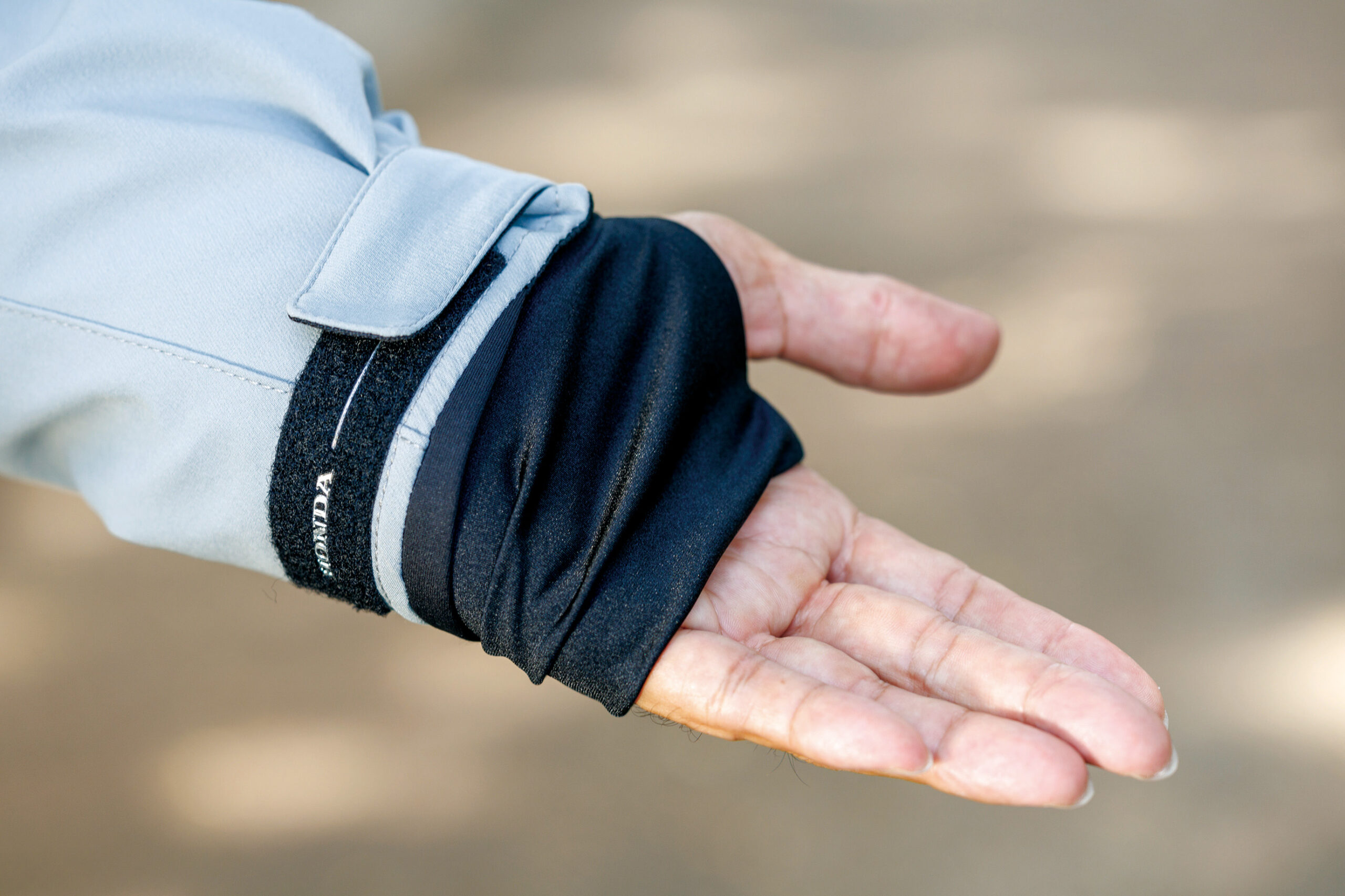 袖口は、親指を通せるデザインになっている。袖口が捲れることを防止し、風の侵入をシャットダウンする仕組み。着脱式の保温インナージャケットは、単体で使用することも可能。「撮影日は秋晴れで、20数度の気温ではインナーが暑く感じました。寒い冬には、効果を発揮しそうですね」