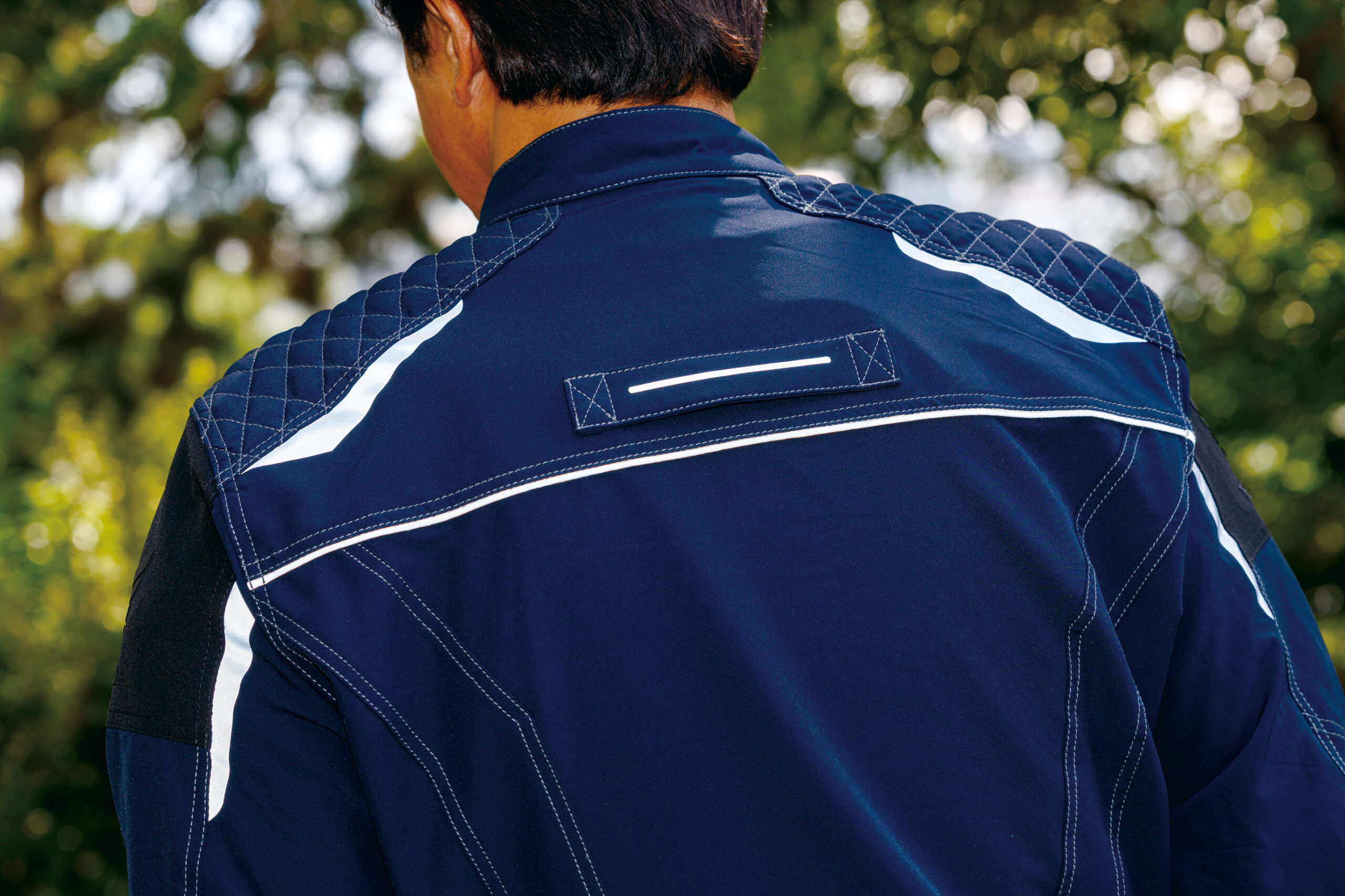 この「ネイビー」のようにシックな色合いのウエアは夜間視認性が明るい色合いより劣るが、ホンダ製ジャケットはいずれも反射材を各所に配置するので夜も安心だ。