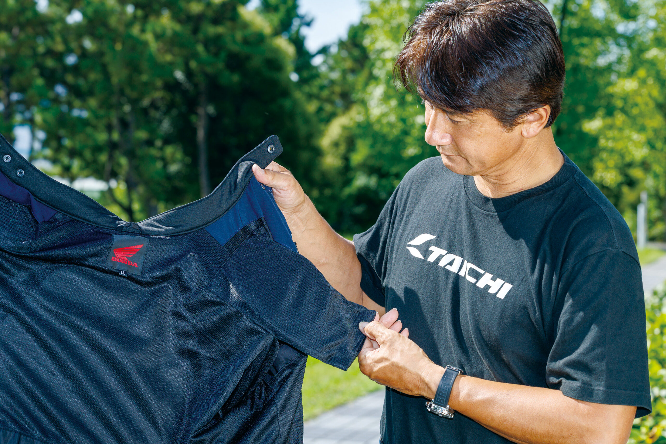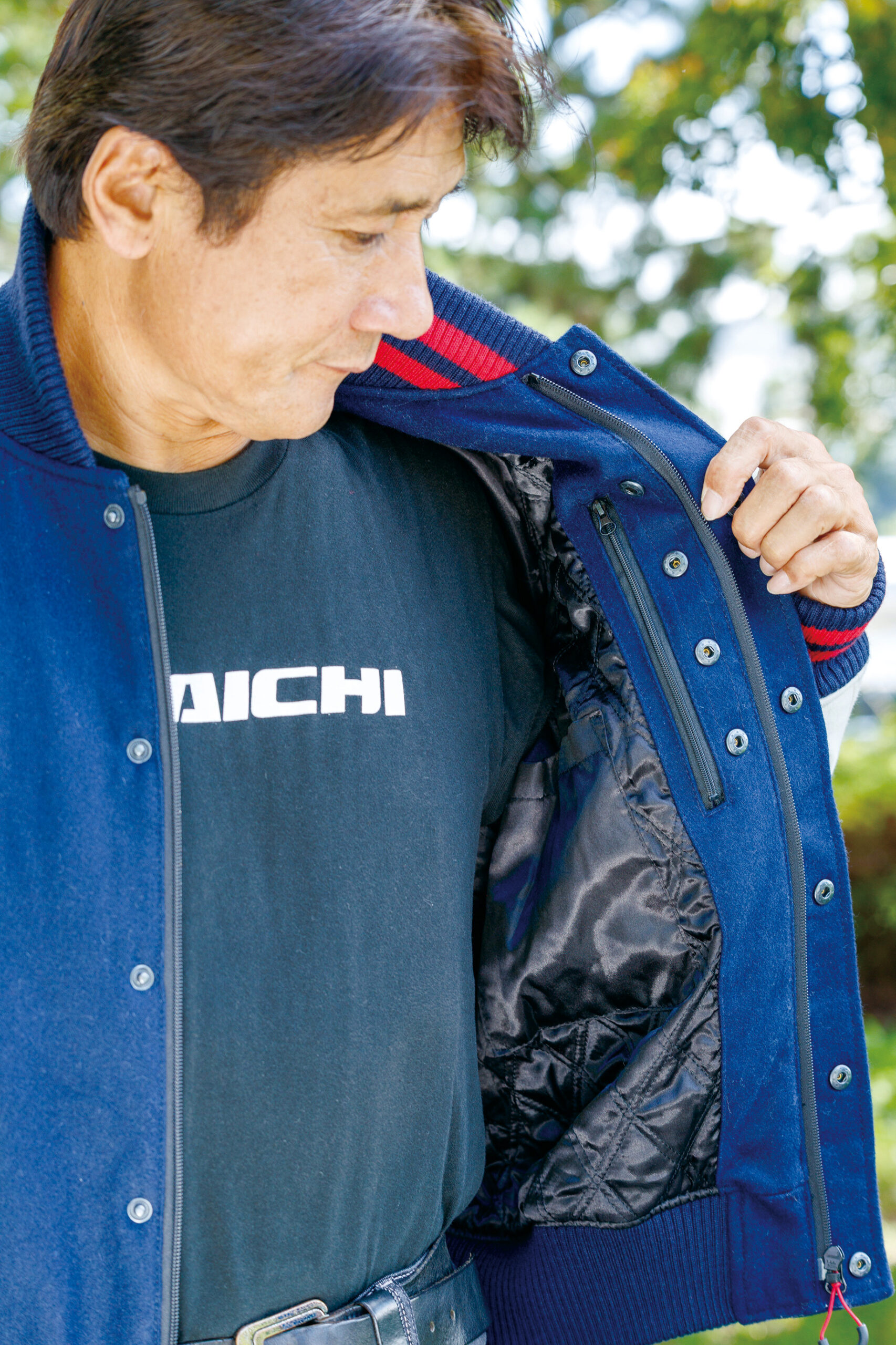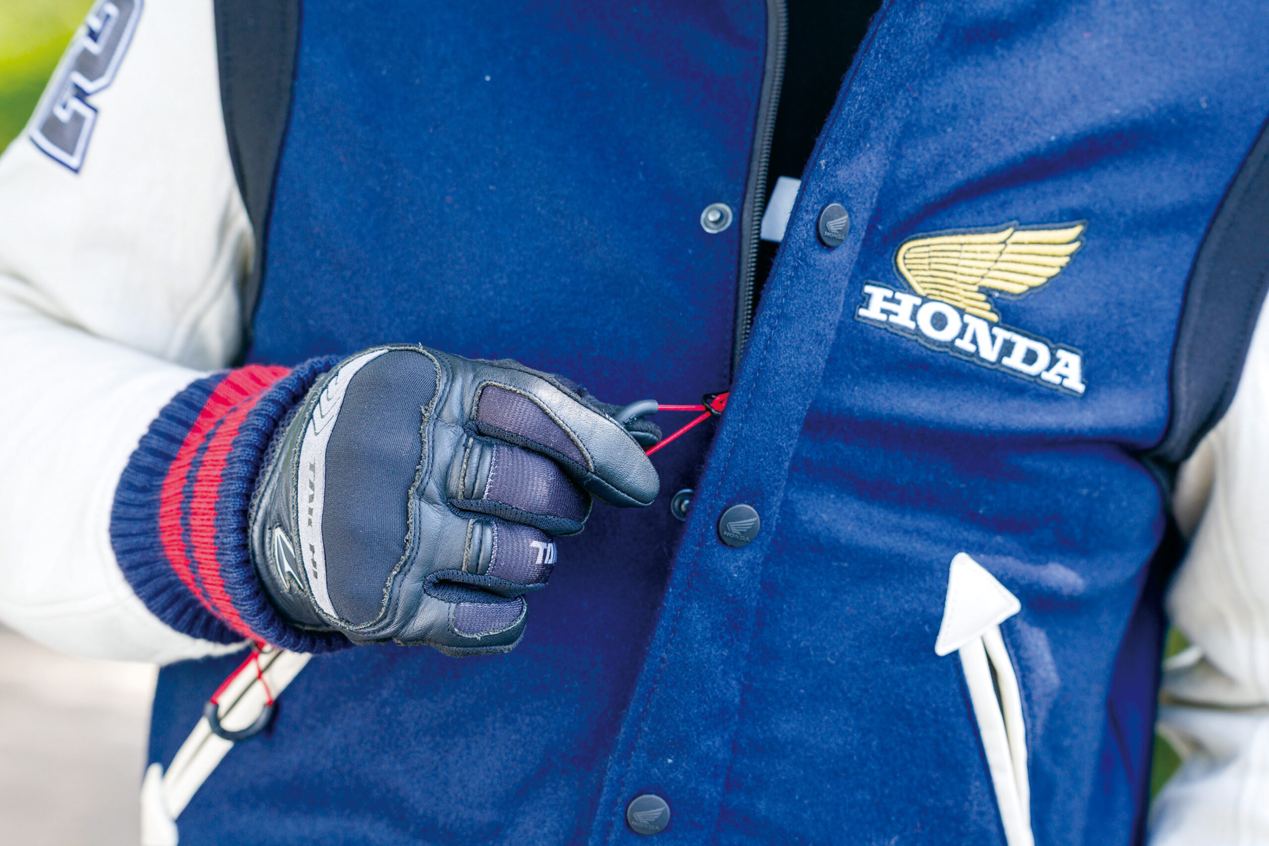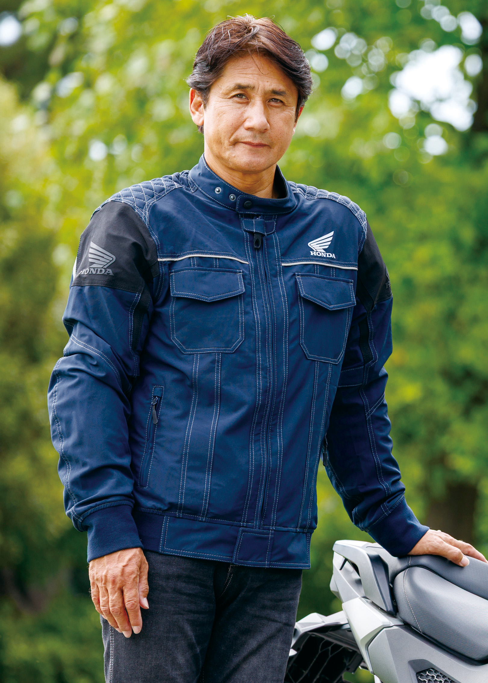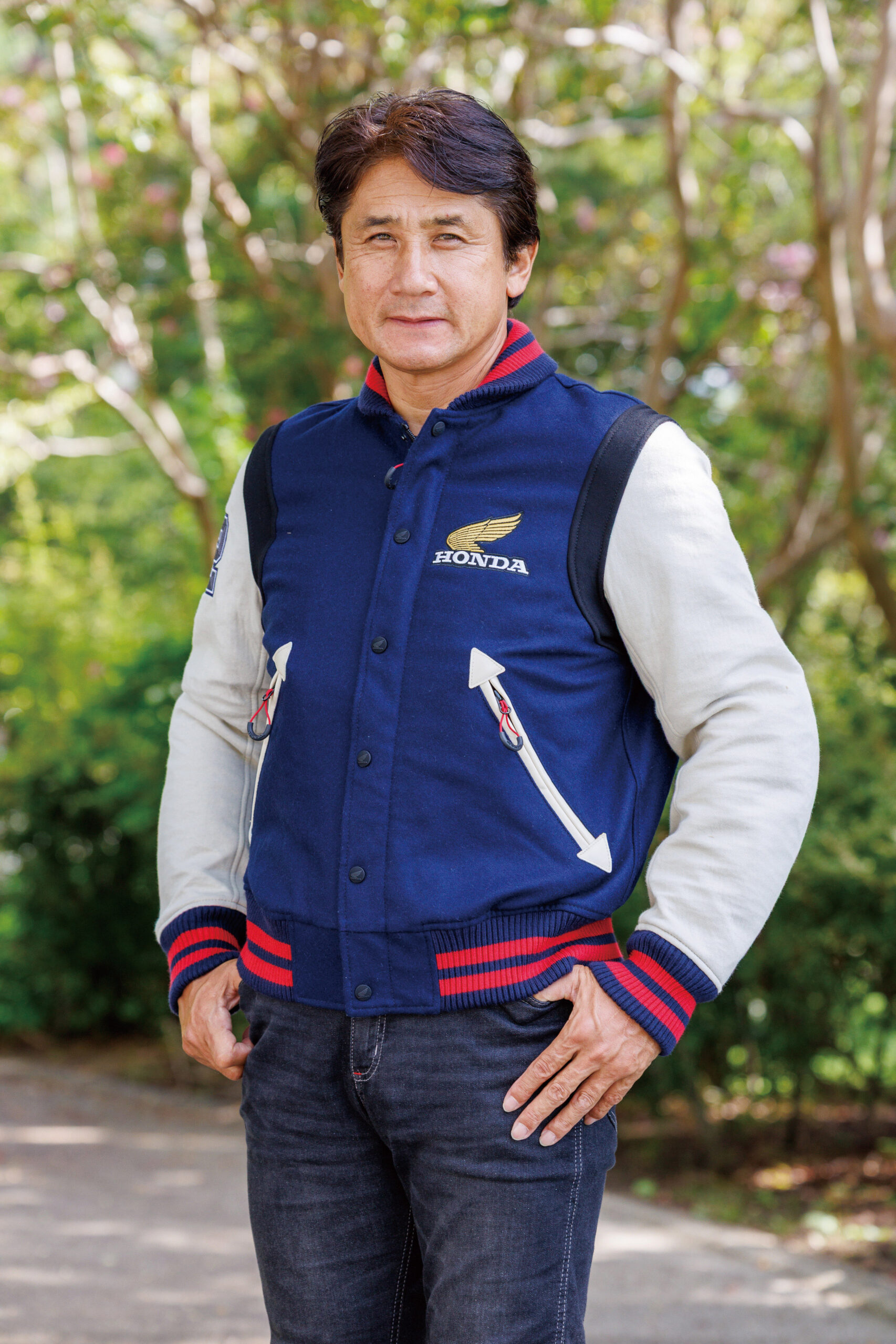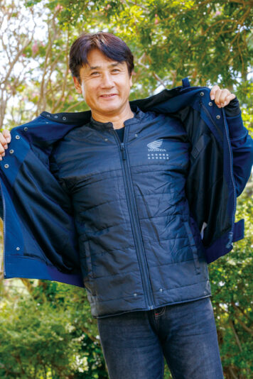 「スタジアムジャンパーは、自分が学生だったころに流行りましたので懐かしく思えました。今の自分の年齢だと、ちょっと若ぶっているみたいで気恥ずかしさあります(笑)。初のホンダ製オフロード用2ストロークであるエルシノアがデビューした、72年当時のウイングマークのデザインがレトロで良いですね。スタジアムジャンパーは重くて着ていて暑そうな印象がありましたが、この製品はそのようなことがなくて、とても着やすかったです」