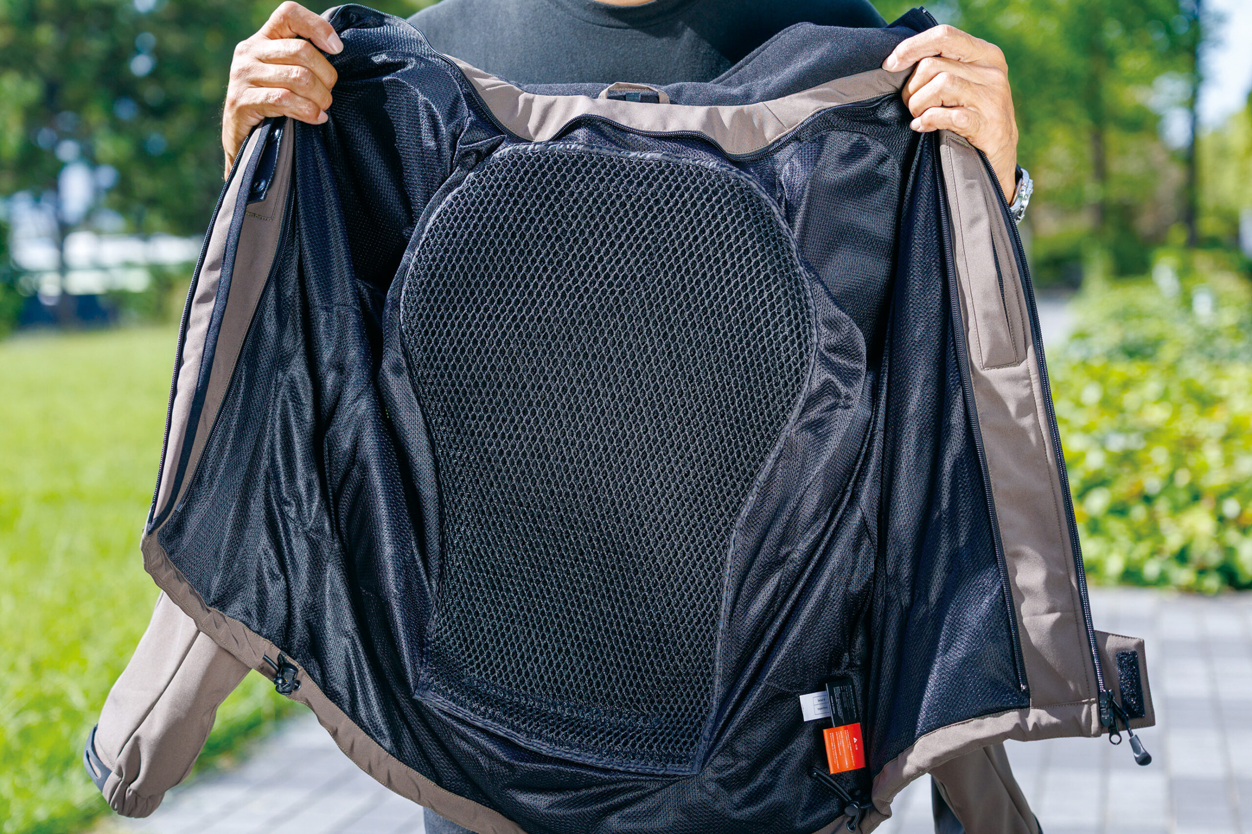 脱着可能な保温インナーを装備。インナーとアウターの間には、各種プロテクターが配置されている。