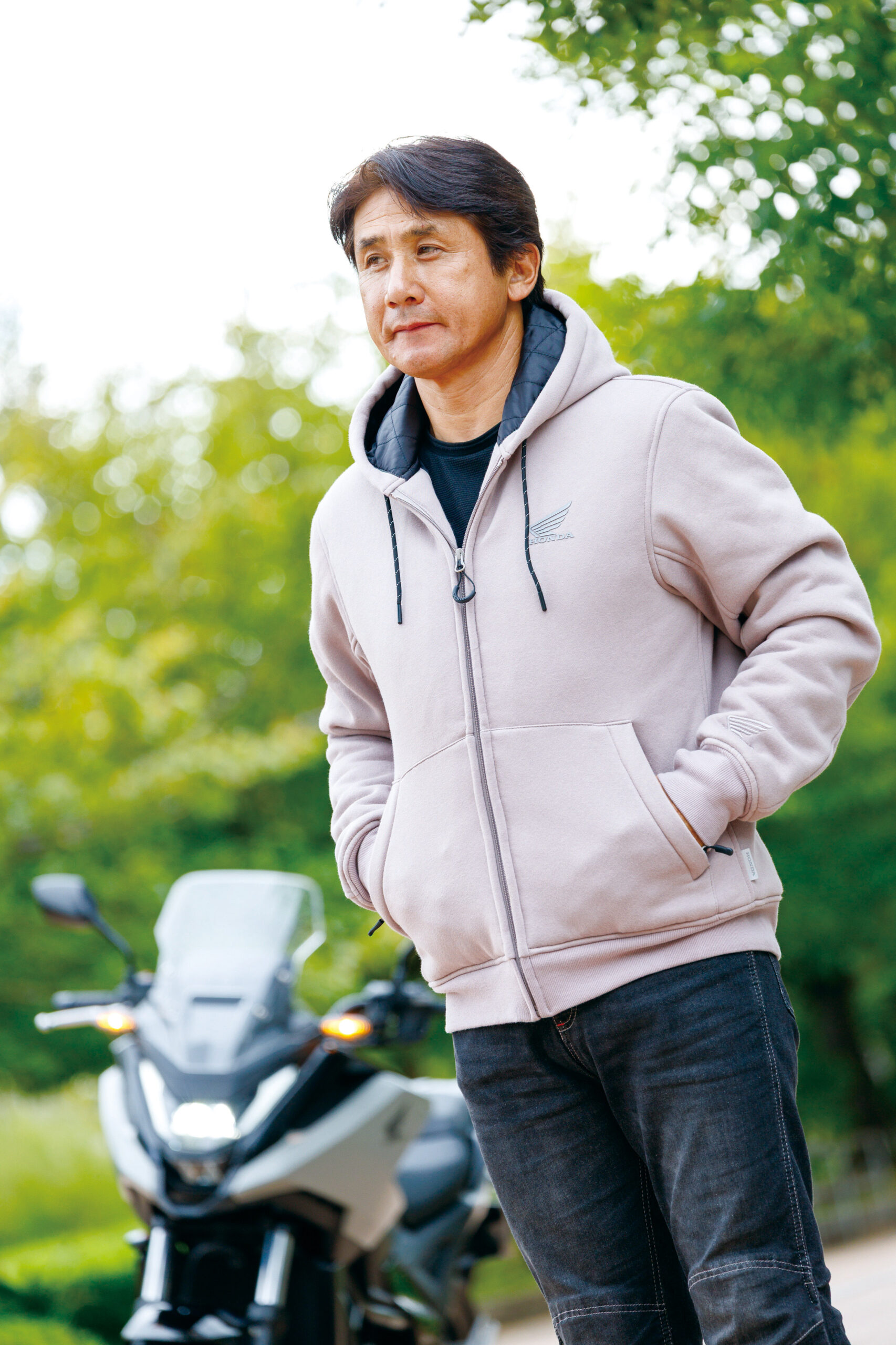 「この一着はGB350シリーズやレブルシリーズなど、街乗りも楽しめるモデルに似合う製品ですね。男性はもちろん、女性ライダーには特に受け入れられるデザインと思いました。パーカはあると便利な一着ですね。自分も特にパーカ好きというわけではありませんけど、夏以外はとりあえずこれで良いか? という感じでいつも着用しています(笑)。街着風なアイテムに見えて、プロテクターをしっかり備えているのも良いです」