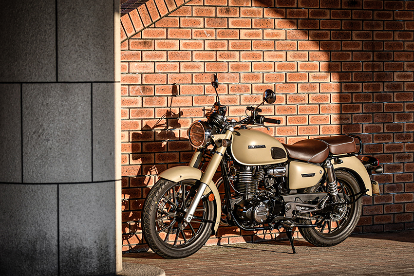 そこかよ!? と思われる人もいるかもしれませんが、実車を見て何より驚いたのは車体のボリューム感だったんです。新色によるミリタリー感も相当なものですが、明るめのカラーというか、色彩として膨張色となる「マットサンドストームベージュ」によってGB350 Cがひとまわり大きなバイクに感じられるんです。こういったクラシカルタイプのバイクの感覚で言うと650ccクラスに見える。たぶんバイクに詳しくない人が見たら「大きなバイク」だと思うはず……完全にアンダー400ccクラスの佇まいではありません。