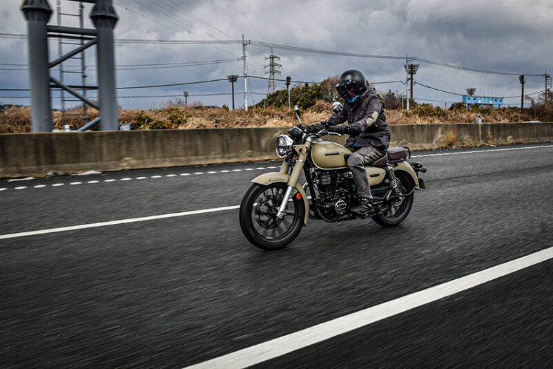 そのときの走りが極めて自然で、それ以上スピードを出そうという気持ちが湧いてこない。このバイクに乗っていると、前方を大型トラックなどに塞がれても不思議なほどにストレスを感じません。時折、やけに遅いクルマをパスするために追い越しをすることはありますが、最高出力20馬力とはいえ「排気量350ccの力強さ」があるので、それほどがんばらなくてもスルリと追い越しも完了。そこから再びマイペース・クルージングへ。