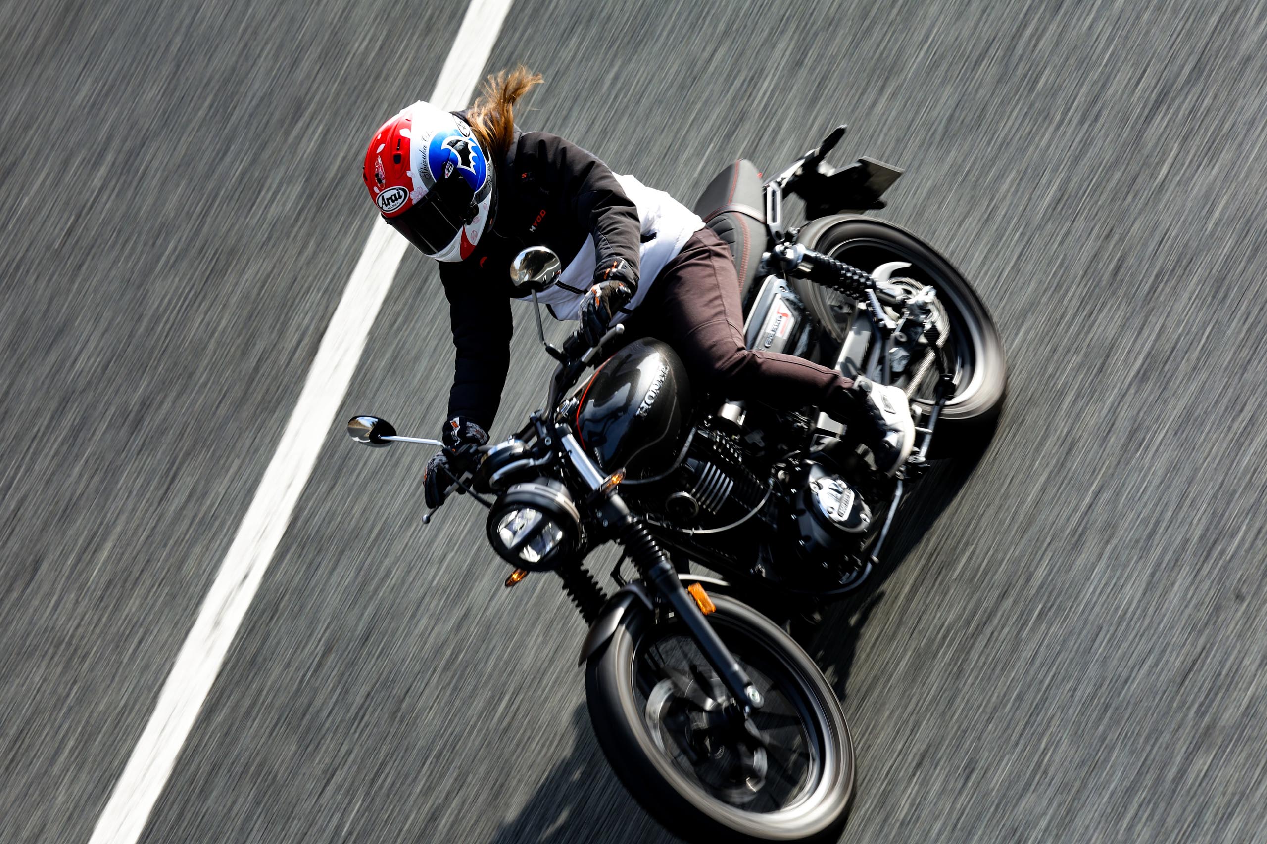 GB350 Sのハンドリングは、GB350と比べたら現代的。リヤタイヤのラウンドを感じつつバンク角の増減をコントロールする楽しさがあります。前輪はシリーズ共通の19インチ径なので、いわゆるスポーツネイキッドほどのクイックな旋回性はありませんが、リヤタイヤを機能させることでスポーティなフィーリングをより得られるし、そうやって積極的に操りたくなる乗り味になっています。