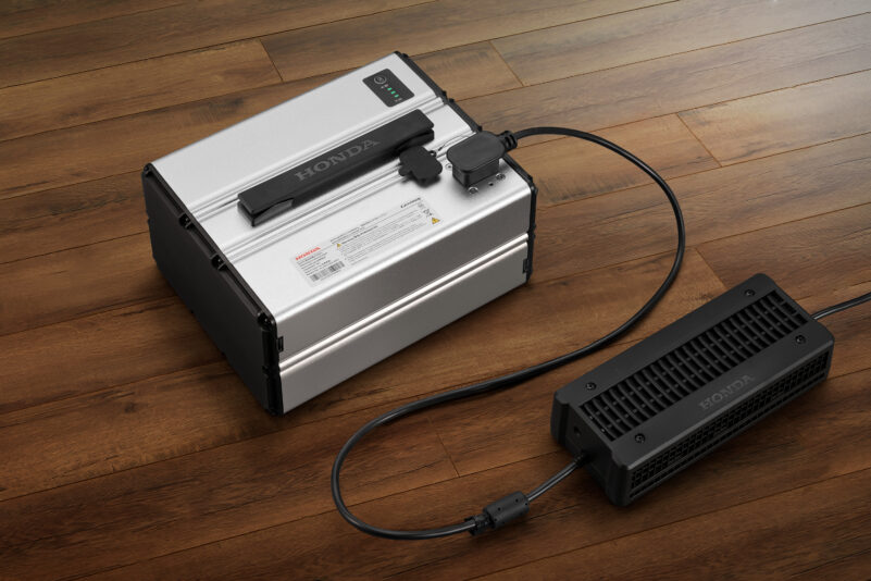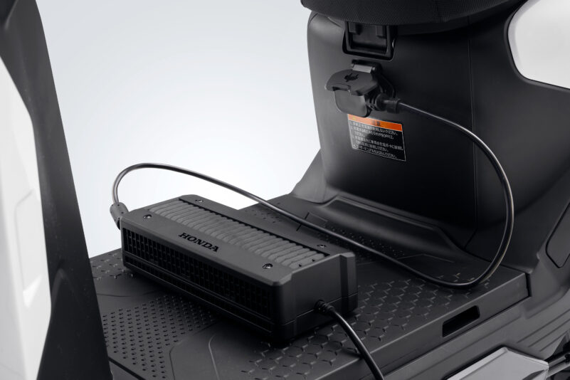 充電にかかる時間は(目安として)25~75%まで3.5時間、電池残量ゼロから100%までは8時間となっています。同じくHondaがラインアップする原付一種相当のEVスクーター『EM1 e: 』と比べると若干、充電に時間がかかる印象ですが、これは『就寝時など夜間に充電する想定』で出力を抑え、バイク本体の低価格化を狙った結果。