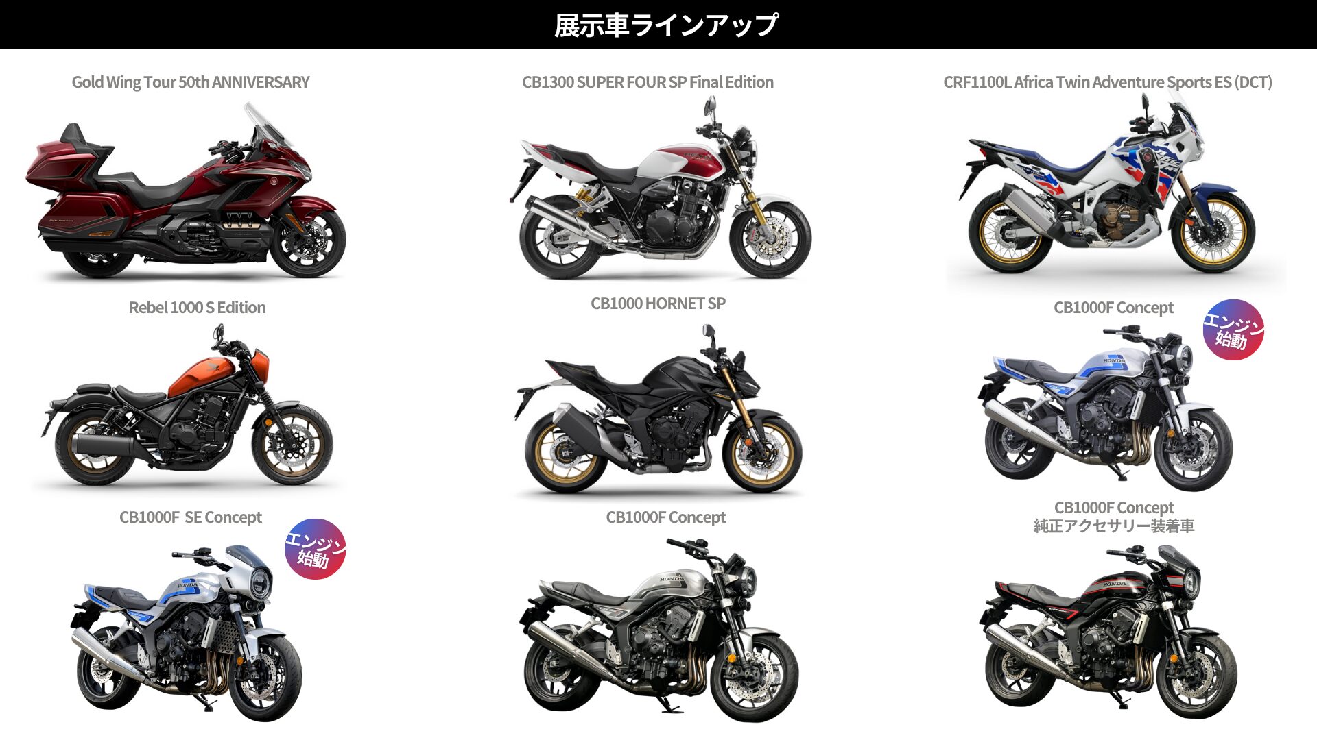 (株)ホンダモーターサイクルジャパンが開催するイベント会場への不正改造車の入場は固くお断りします。 とくに不正改造マフラー取付車両でのご来場は、他のご来場者様含め会場付近の方々すべてのご迷惑となり、イベント自体の開催にも影響を与えることが予想されます。 また、法律に適合しない不正改造行為を行った場合は、厳しい罰則が課せられる場合もあります。 法令に基づいた適切な車両整備、道路交通法に則った安全運転で豊かなバイクライフをお楽しみいただきますようお願いいたします。
