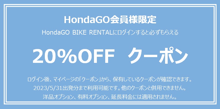注意事項 ※他のクーポンと併用はできません。 ※洋品オプション、有料オプションには適用されません。 ※延長料金には適用されません。 ※当該クーポンは2023年4月26日時点でHondaGO BIKE RENTALにログインした履歴の無いHondaGO会員様限定で配布しています。